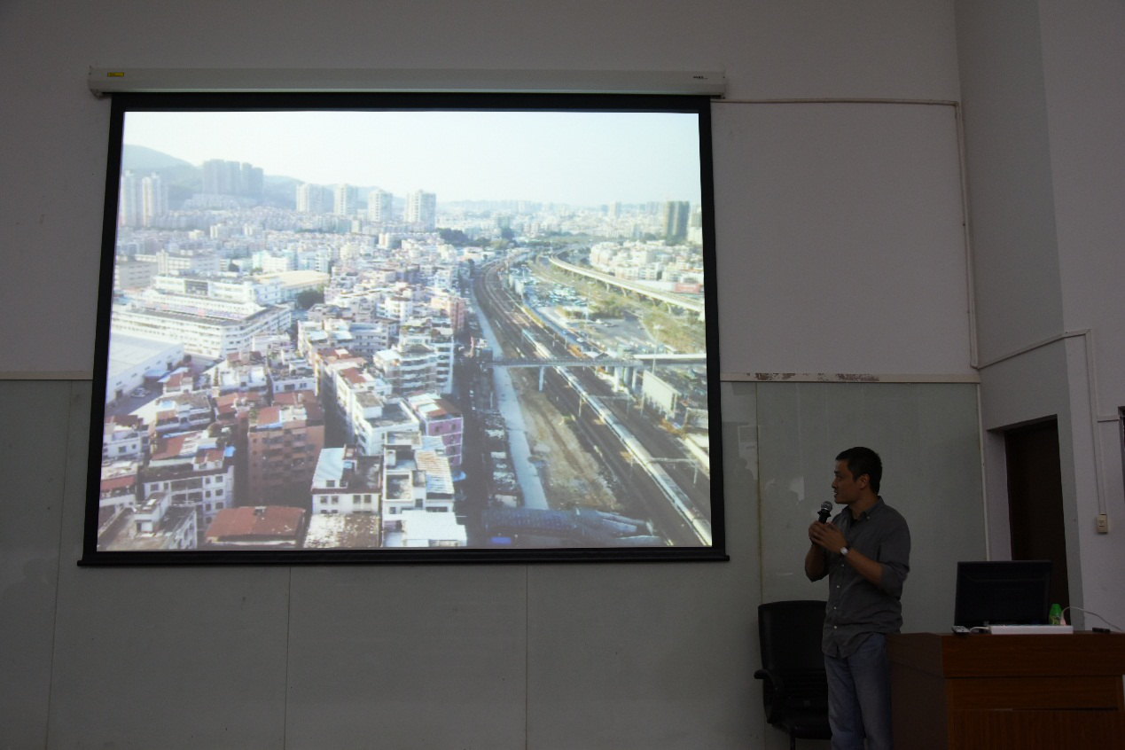 晚上7点多,唐克扬先生就到了现场,一头干练的黑发,衣着朴素。唐先生首先进行自我介绍,他在芝加哥大学和哈佛大学学习建筑设计的经历令人艳羡。据悉,唐克扬先生目前已累积发表了大量的中英文文章,而在现场,我们也感受到了唐先生扎实深厚的学术功底。此外,本次他也分享了自己在深圳罗湖所做的项目,向我们展示一个城中村如何进行物流再生,提供了一个生活模仿艺术的鲜明例子。而后,唐先生还阐述了景观与风景的区别,他认为,景观最主要的功能就是与人联系,提供一个观看的视角;而风景则是人与自然的关系。