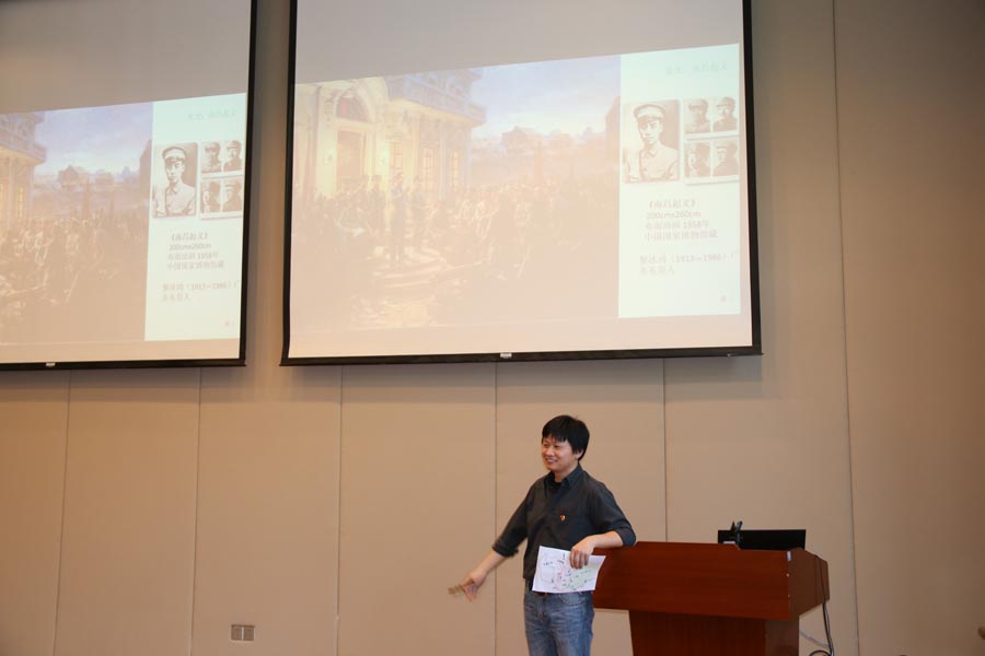 这堂别开生面的党史课不仅讲历史,也讲“专业”——美术。温平以美术作品为例说:“《南昌起义》油画里位于黄金分割线位置的周恩来让观众能够迅速捕捉出油画里的主角,枪指向的方向暗喻了革命的方向,而1959年的油画《飞夺泸定桥》里那条横穿画面的铁索桥则‘再现’了长征途中地势的险恶、战争的紧张。”