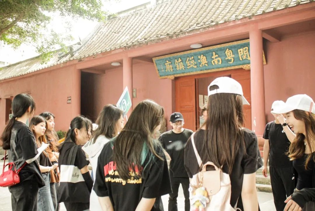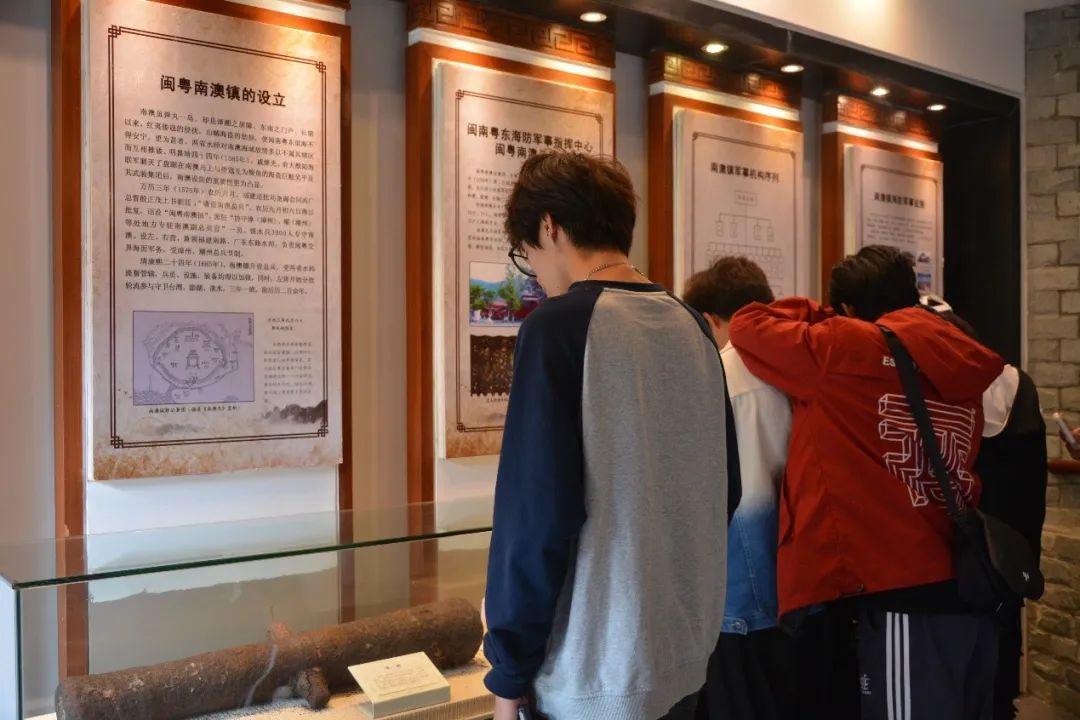 由街入巷,随着古榕树枝叶映入眼帘,同学们抵达闽粤南澳总镇府,郑成功的雕像伫立在旁,旁边的古榕即“郑成功招兵树”。进入府内,海防史陈列馆记载着明清时期南澳的海防建设和事迹,帥堂里复原的办公陈设彰显着庄严肃穆,两旁陈列的兵器生动诉说着誓卫国土的壮志,南澳历史,被浓缩进了一个小小空间里……革命薪火代代相传,重温海岛烽火岁月,感受英雄风范,崇敬之情油然而生。府邸前方有一块刻有“闽粤界”字样的石碑,这里便是闽粤两地的交界地带。