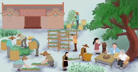 张悦的《潮汕功夫茶》创作通过对茶叶前期的加工进行刻画来使观众可以更好的将采、晒、炒、品与功夫茶进行更加紧密的结合,并通过孩童煮茶老人喝茶的方式体现人们对功夫茶的传承。