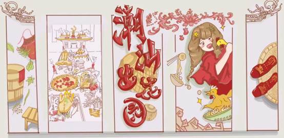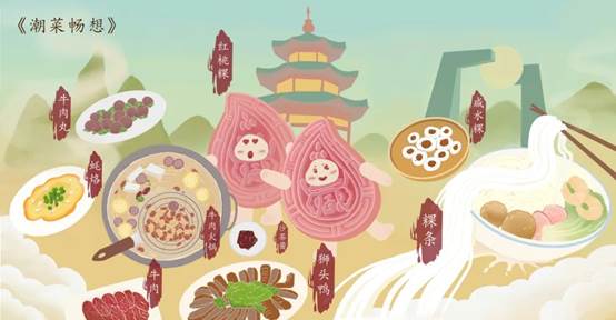 潮州菜作为一种历史悠久的地方菜,崇尚清淡口味,制作工细精巧,注重养生。潮州菜在选料、制作、火候、调味和营养配置等方面都具有鲜明的地方风味特征,取材广博,特别擅长烹制海鲜,素菜荤做,调味独特,追求色香味俱全。作品《潮菜畅想》主体红桃粿形象用拟人的画法,产生互动性的画面展现,其它菜谱以简单的绘画方式表现,体现画面的灵动性和活泼性,展现潮菜的特色之美。