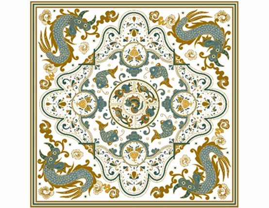 陈霖霖同学的《山墙》以潮汕建筑中特色的山花(山墙)作为主要元素,根据山墙形状选取了水式,水形平而生浪;并以传统藻井样式为框架,节奏为三重递进,中间为天井,四周为山花(水式),山花的花肚为卷草纹,有连绵不断、吉祥之意;腰肚为石榴纹,寓意人丁兴旺、团结、喜庆;浮楚为水纹,以装点。屋檐上为龙,寓意风调雨顺,屋檐下为鱼,祈求居家平安;同时以水纹为底及其他象征吉祥纹样为辅,如鱼纹、石榴纹、卷草纹等。