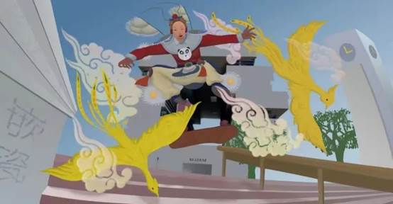 来自数字媒体艺术专业的黄瑞文同学创作《嵌“行”》,以潮汕“嵌瓷”为题材,通过让人物穿着嵌瓷人物的服饰进行街玩滑板,让嵌瓷与现实结合,更丰富的展现出嵌瓷的可能性。