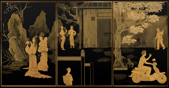方月媛、廖雪怡的《陇美金漆画》作品为潮汕陇美金漆画,作品保留了金漆画的独特绘画风格与形式,用黑底勒金为画。同时引用了金漆画常见的山水人物题材,并将其原本的古典内容与潮汕居民现代生活相融合,展现出了潮汕地区时代的变迁和传统文化的传承,以及金漆画历久弥新的非遗魅力。