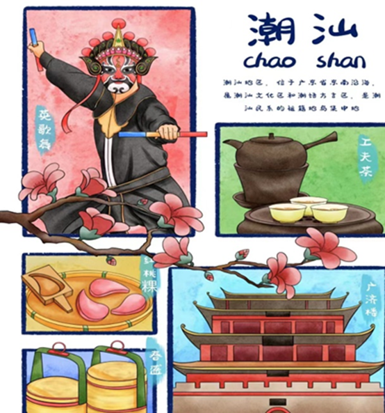 22公共艺术专业的陈治宁的作品《潮汕特色》通过将潮汕传统戏剧,茶文化,潮汕红桃粿等代表性的物品作为涂鸦素材进行组合让人们在观看过程中明显地感受潮汕特有的文化,增强我们的文化自信,用艺术传达文化自信,增强文化自觉。