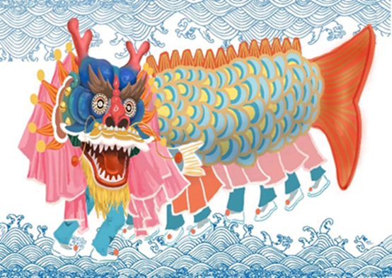 《澄海鳌鱼舞》设计选题来源于澄海鳌鱼舞。澄海鳌鱼舞是广东省非物质文化遗产,其鳌鱼道具形象夸张,龙头鱼身,形态奇异,色彩鲜艳,非常引人注目。因此我的作品着重刻画了鳌鱼道具的独特造型,凸显鳌鱼舞的气势磅礴,展现了舞者舞动鳌鱼时的生动活泼的画面。