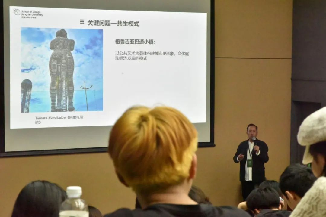 当谈及公共艺术专业的发展时,赵老师认为有两个关键问题特别值得注意,其一是构建方法,其二是共生模式。通过分析世界各地公共艺术实践典范,赵老师向观众展现出公共艺术共生模式的面貌:当公共艺术与生活共生,它是舆论的、参与的,是可以自由交流和探讨的;当公共艺术与城市共生,人们应当在装置艺术的天地里,享受艺术,品味城市;当公共艺术与乡村共生,公共艺术应当在助力乡村振兴上展示艺术家的时代担当;公共艺术与经济共生,文化应当作为经济发展的驱动者;公共艺术还应该与民族自豪共生,艺术家应当注重地区的特色文化创意,激发原住民自豪感并且打造拥有艺术氛围的人文旅游向往之地。