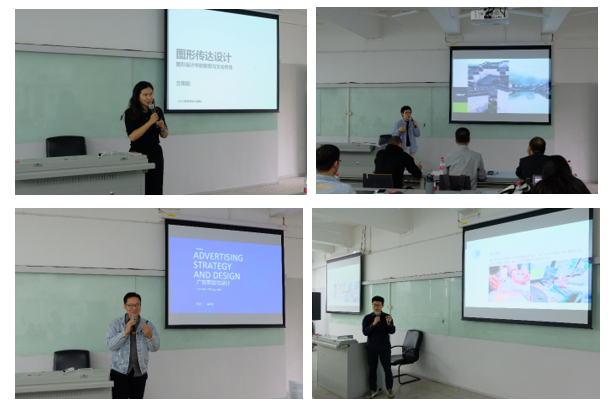 比赛开始,五位参赛教师各展风采,从所教授的课程出发,介绍课程总体设计、课程思政融入、课程创新设计等内容,展示了各自的教学特点与创新特色。兰佩阳老师的图形传达设计课,讲授了图形设计中的联想与文化特性,利用图形中包含的独特意义来传播中华文化;林蔚蔚老师的色彩设计课,讲授了色彩的文化属性和特定意义,色彩和群体认同的联系,培养员工通过色彩的象征意义来进行色彩设计;赵伯祚老师的广告策划与设计课,围绕广告理论、广告流程、案例分析、个案练习四个部分展开,重点介绍四种广告片的类型;林晓蔚老师的产品设计课,针对大三员工的学情开展,提出产品设计要将设计思维和企业需求相融合;马涛老师的课程将公共艺术和劳动相结合,以社会实践为授课方式,通过服务性社会劳动进行道德培养。