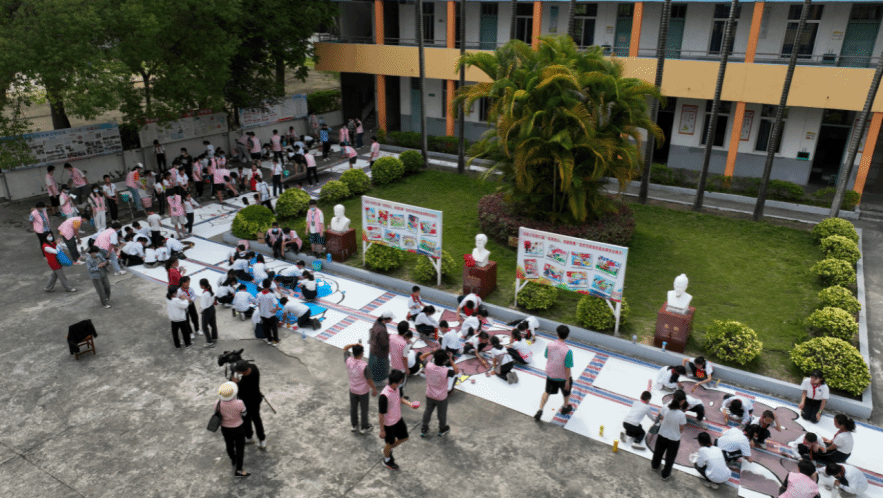 图 5 课程团队策划的浮东小学“防溺水互动公益绘画活动”现场,活动中让小员工参 与绘制保护救生竿的彩绘,并在自己制作的彩绘版上签名,承诺不在该流域玩耍,通过这样的行为既提高了水域的安全,又建立小朋友们“诚信”的社会主义核心价值观。