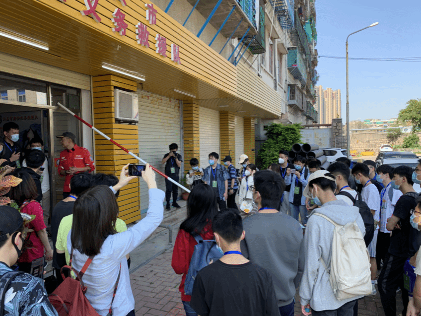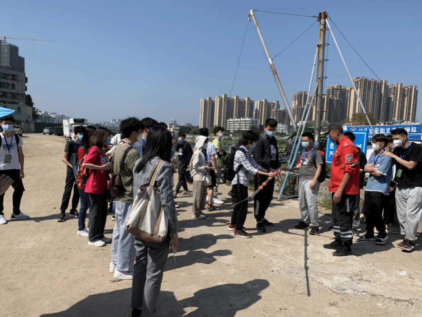 图 2 每次的课程调研活动,所有参与的师生都需要对上期学员项目进行考察,照片中员工们正对前期员工设计制作的“伸缩版爱心救生竿”进行使用感受,并提出相关的问题,据安和义务救援队队员介绍,该救生竿被放置在救生艇上,救援队员曾使用救起一名落水人员。