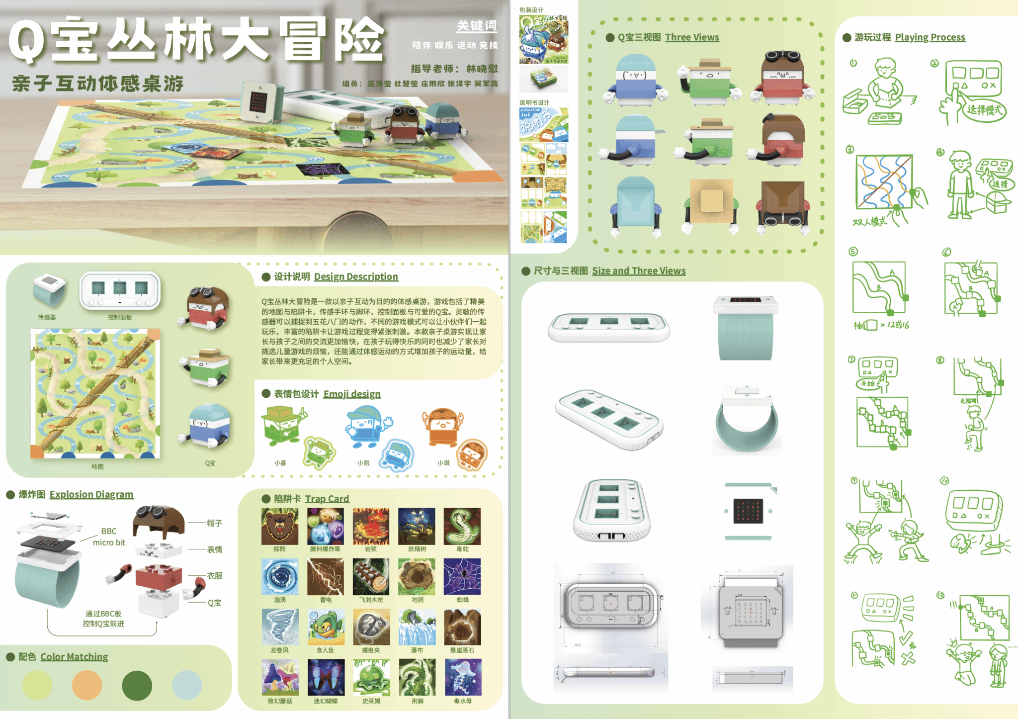 设计说明:Q宝丛林大冒险是一款基于toio开发的体感桌游,它将体感游戏与桌游相结合,通过⼿环感应和识别动作,让玩家以⾝体动作来帮助Q宝在冒险过程中顺利通关。游戏过程中,玩家需要通过特定的动作“逃出”陷阱,也可以通过陷阱卡为对手设置障碍,让游戏过程变得紧张刺激,充满未知性。设计者希望设计出⼀款既有趣⼜有益健康的亲⼦游戏,让家庭成员之间通过玩乐增进交流互动,同时激发孩⼦们对于科技和创新的兴趣。