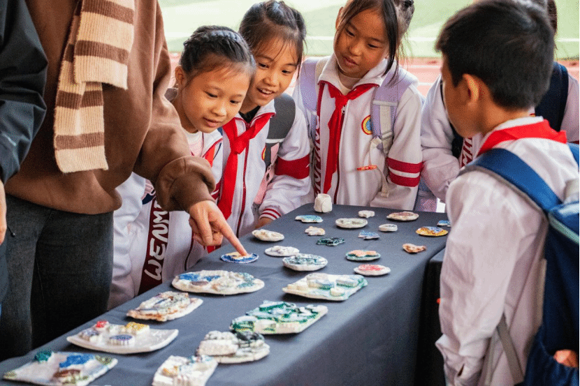作品展当天,莲塘小学的校园充满了浓厚的艺术氛围。展示区被布置得井然有序又不失童趣,展出的陶艺作品从课程前期制作的陶艺印章到模具创作的精美成品,琳琅满目。孩子们用独特的创意赋予每件作品鲜活的生命力,比如一只细腻逼真的高跟鞋、一颗雕刻着可爱小狗图案的印章,每一件作品都在讲述他们丰富的想象与专注的努力。