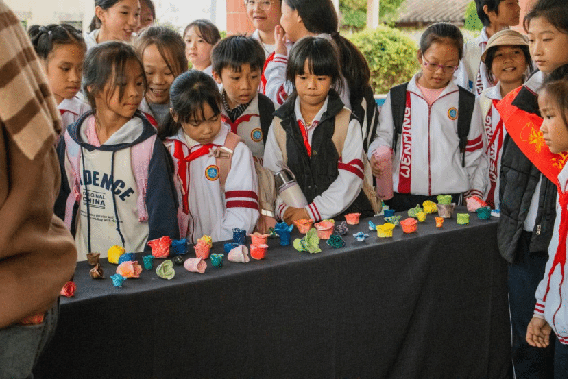 展览现场还设置了一个特别区域,通过屏幕循环播放孩子们课堂学习的过程。从学习陶艺技法到专注于上色的每一个片段,都被一一记录下来。屏幕上闪过的是孩子们揉泥、上色的瞬间,旁边围观的孩子们兴奋地指认着:“这是我在制作小猫呢!”“你看,那时候我的印章还没完成呢!”