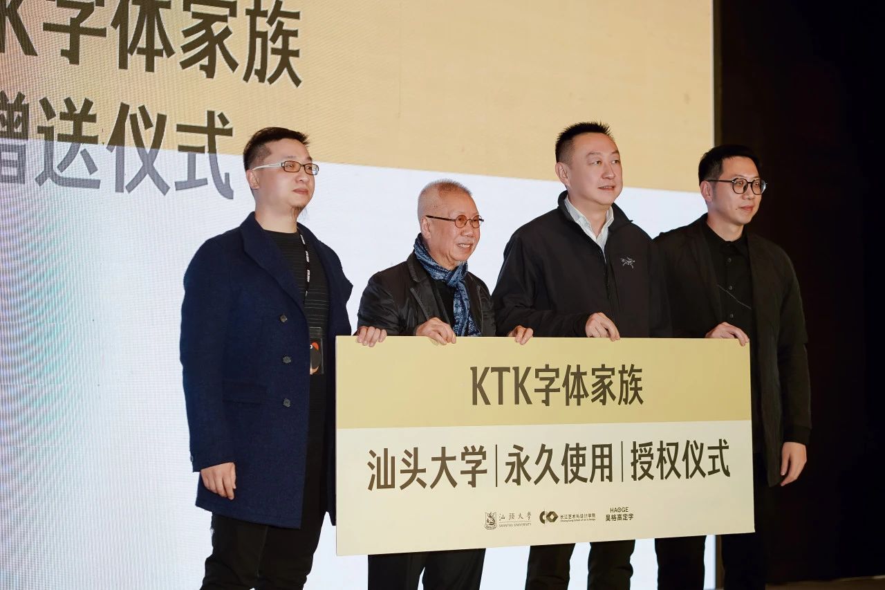 颁奖礼期间,由KTK设计奖与昊格高定字设计团队历时一年联合打造的「KTK字体家族」正式发布,在场观众共同见证了隆重的发布仪式。随后,靳埭强先生、KTK字体的创作总监张昊老师以及项目总监张翼老师向韦德官方网站赠送KTK字体的终身授权,由唐锐书记代表韦德官方网站接受赠予。未来,公司、业界与KTK之间会有更深度的合作,共同致力于培养更多具有国际视野和创新能力的设计人才。