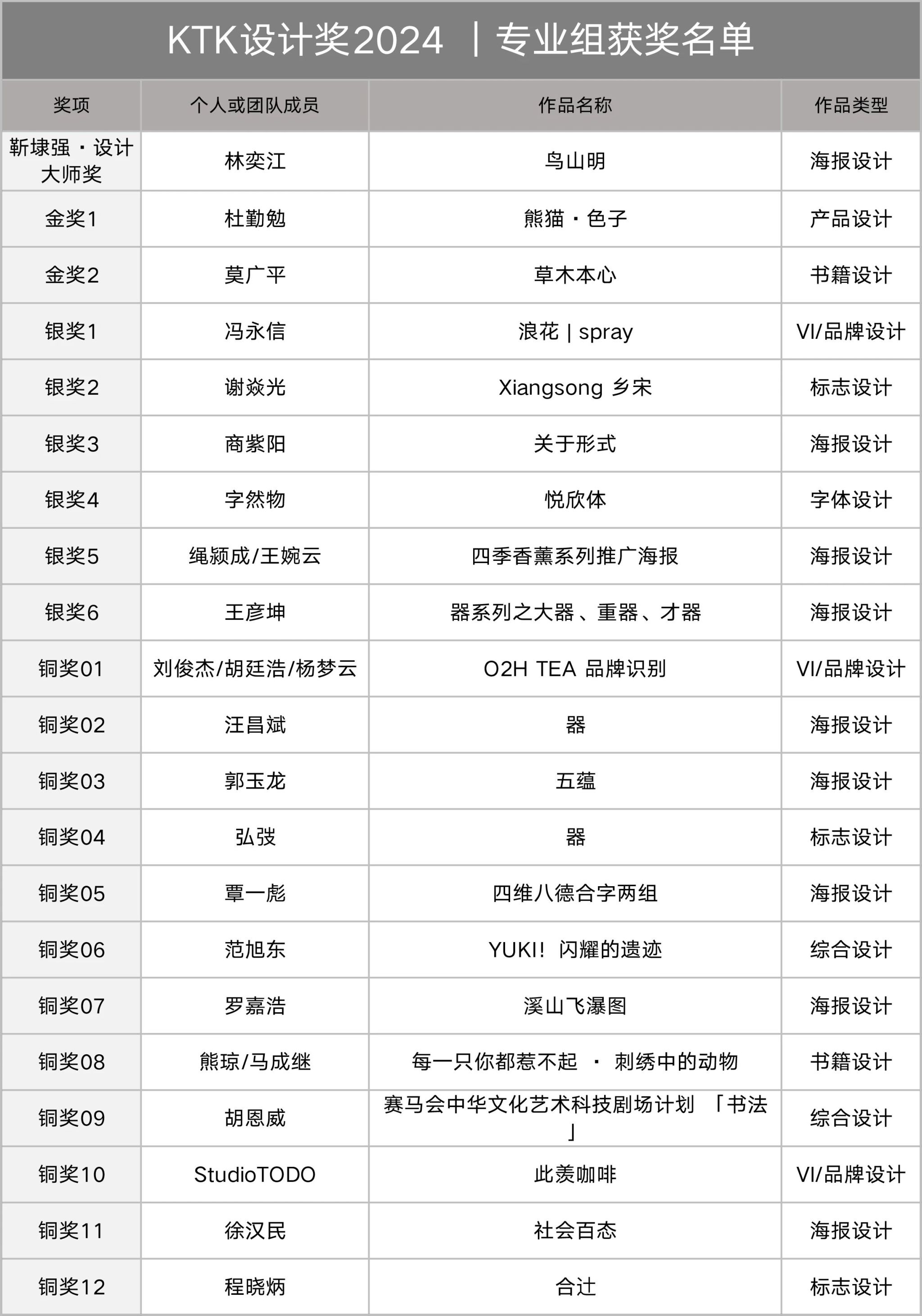 林奕江的海报设计《鸟山明》获得评委一致肯定,被全票授予本年度专业组全场大奖「靳埭强·设计大师奖」!专业组金奖由杜勤勉的《熊猫·色子》与莫广平的《草木本心》夺得。员工组全场大奖「靳埭强·设计师大奖」由来自中国美术公司的叶子、刘馨、徐雨萱同学凭借交互设计作品《书以观象》斩获;来自宁波大学科学技术公司的陈宣琪同学与广州美术公司的郑紫文、谷奇、陈家琪同学分别获得两个员工组金奖。