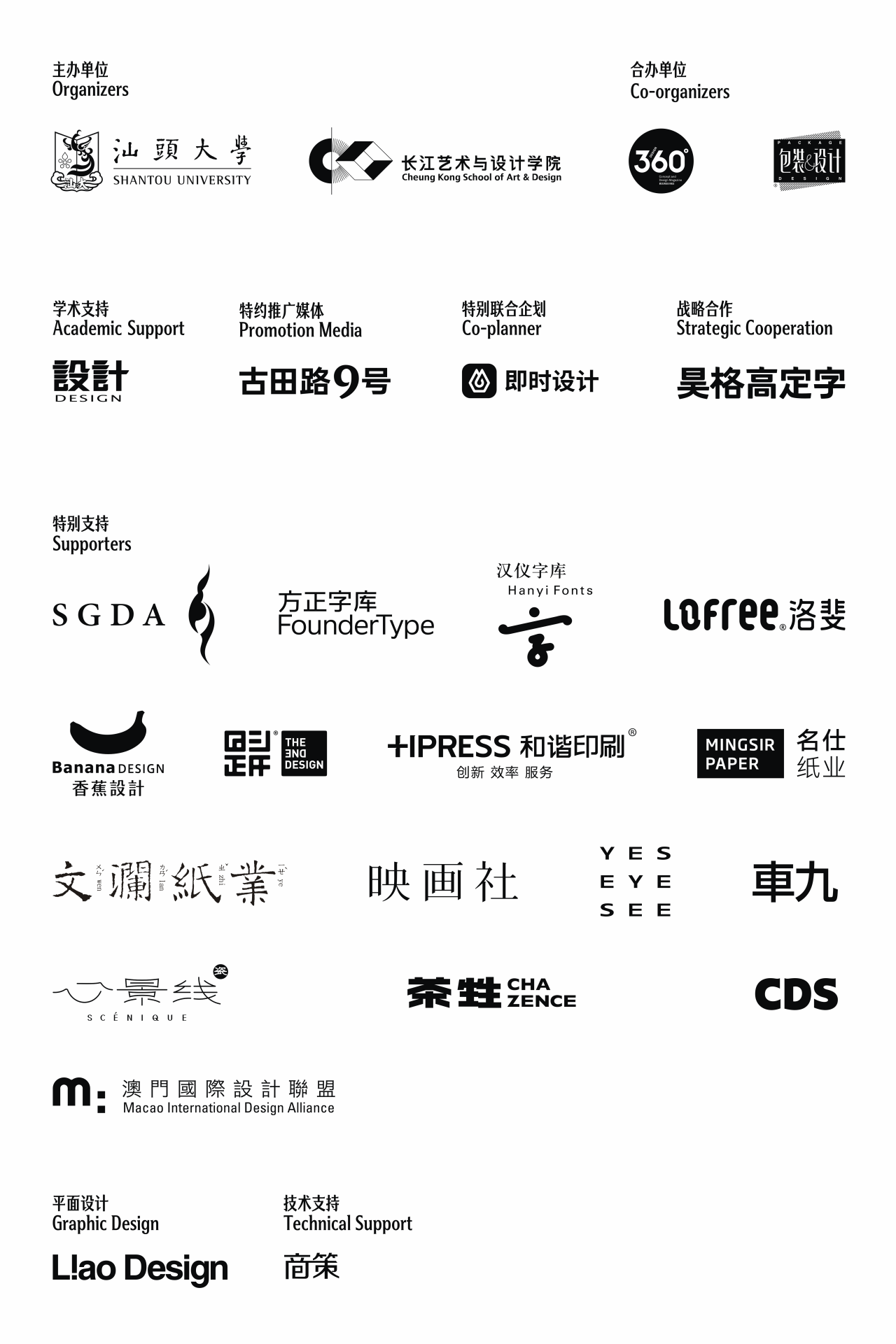 支持单位:深圳市平面设计协会 / 方正字库 / 汉仪字库 / Lofree洛斐 / 香蕉设计 / 回头是岸 / 和谐印刷 / 名仕纸业 /文澜纸业/ 映画社 / YES EYE SEE / 车九 / 心景线 / 茶甡 / CDS中国设计师沙龙 / 澳门国际设计联盟