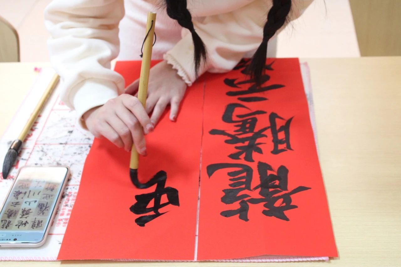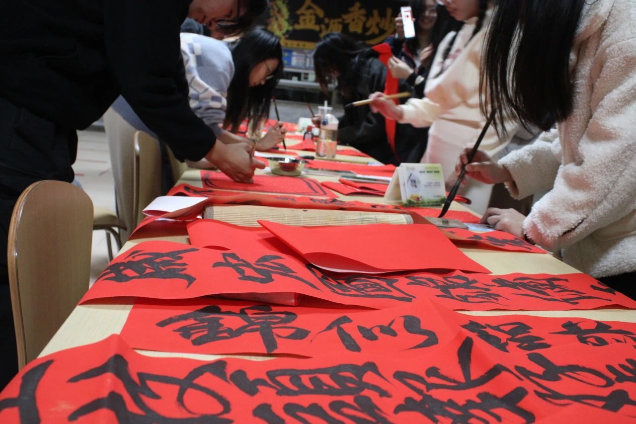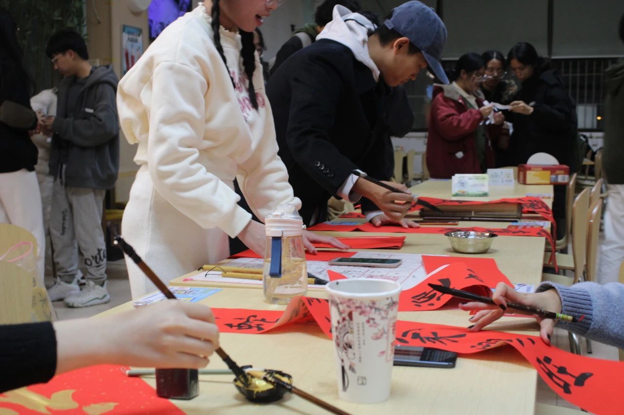 活动设置了书法表演与教学环节,由书画协会展示并指导同学们书写“元旦”“新年”主题作品。现场墨香四溢,同学们挥毫泼墨,笔走龙蛇,一幅幅寓意吉祥的福字和对联在他们的笔下应运而生。无论是行云流水般的楷书,还是遒劲有力的行书,每一笔每一划都蕴含着对新春的憧憬与祝福。同学们纷纷写下自己的新年祝福,共同分享新年的喜悦和快乐。