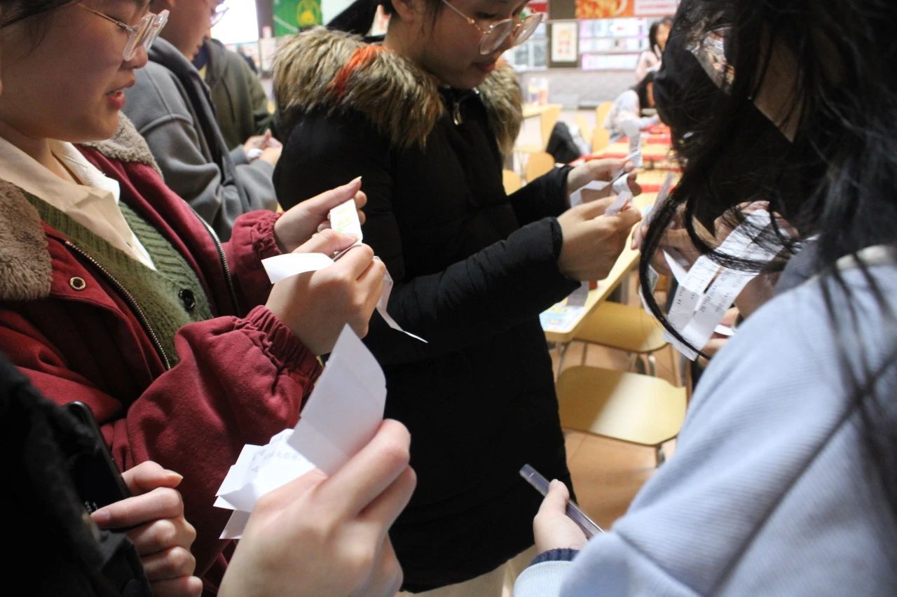 灯谜,元旦佳节不可或缺的传统活动。活动还安排了灯谜竞猜环节,以“蛇”为主题,设置了一系列成语灯谜游戏,游戏既丰富了同学们的成语知识储备,又增添了“年味”。猜对谜底还可获得精美蛇年摆件小盲盒一个或对联一副。大家相互交流讨论,欢声笑语不断,整个活动现场洋溢着浓厚的节日氛围。