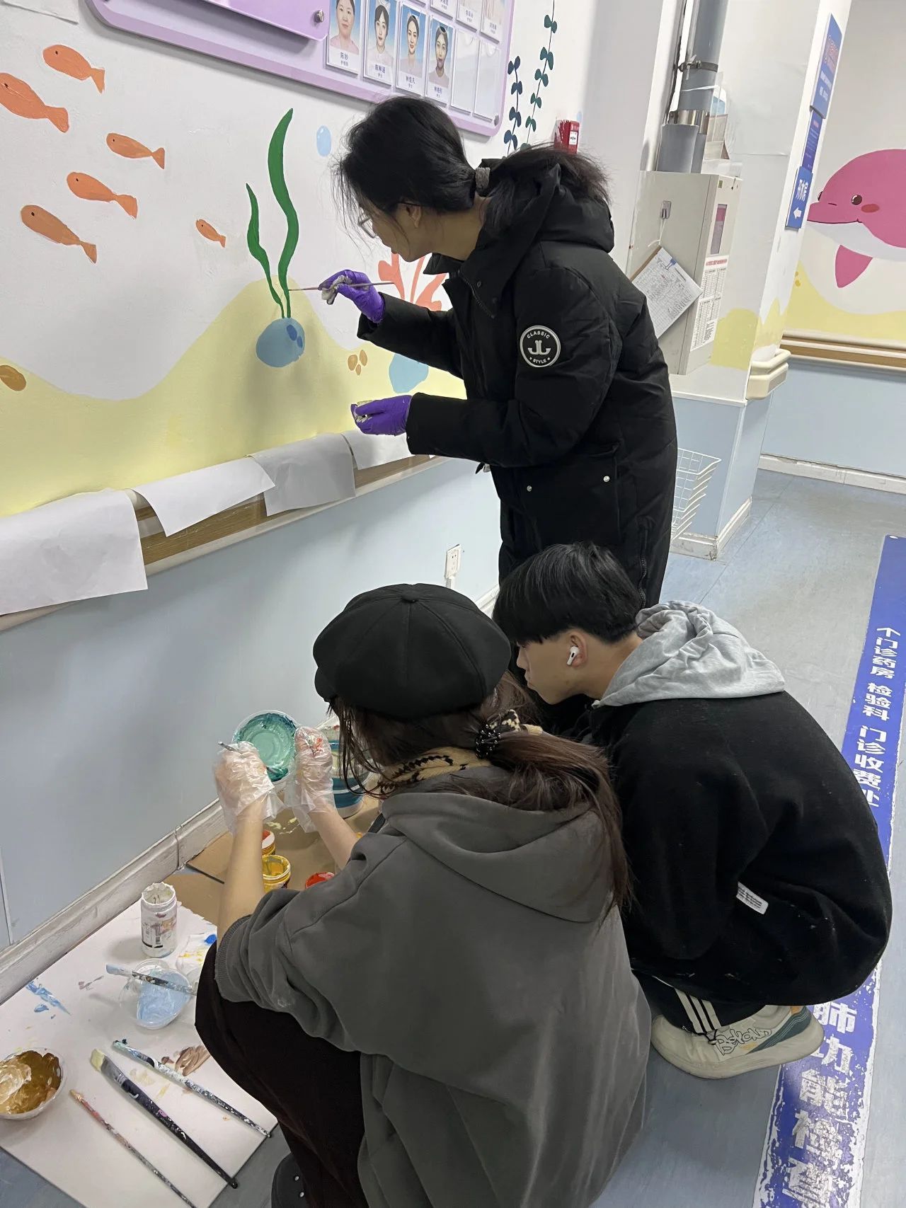 2024年12月11日,bevictor伟德官网美育师生团队在公司党委纪荣信副书记的带领下,前往韦德官方网站医公司第二附属医院儿童医院进行实地考察。通过实地勘察,确定墙绘主题、墙面绘制方案、测量墙面尺寸等,并就墙绘绘制方案与医院工作人员进行深入交流和探讨。初步考察基础上,艺术学子们发挥创意,结合儿童医院的属性和蓝色主调的视觉需求,利用时下热门IP形象,集思广益、打磨完善,精心绘制了海底世界的主题墙绘方案,实现将创意与实际需求相结合,既符合医院需求,又贴合孩子们的心理期待。