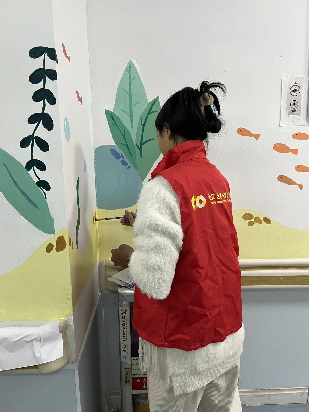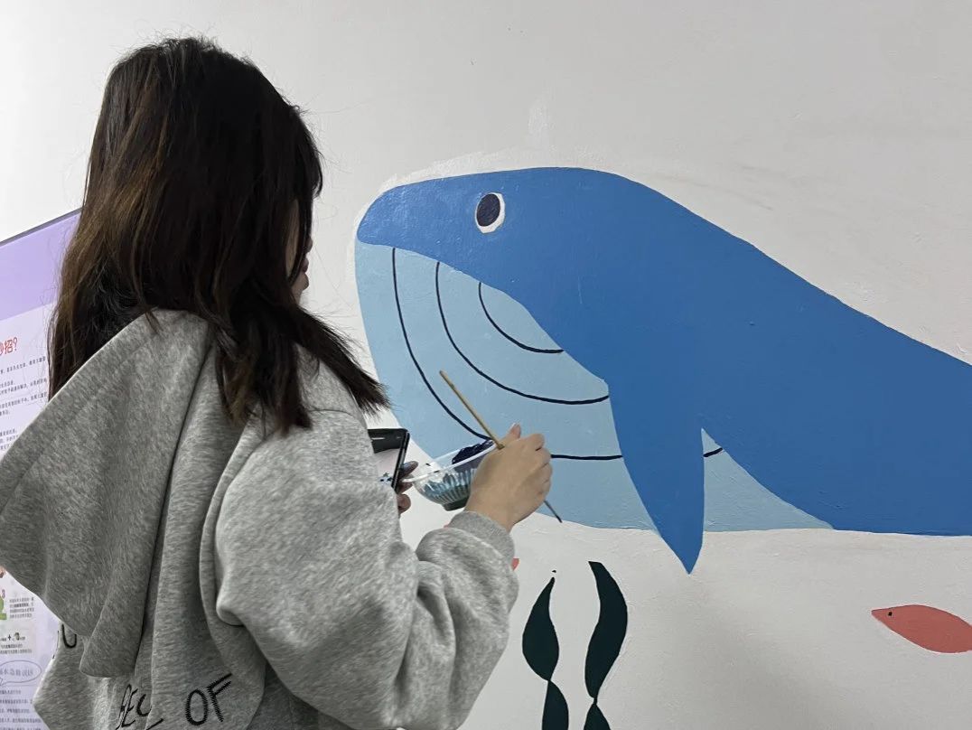 随着墙绘工作的逐步推进,一幅幅生动有趣的画面逐渐呈现:海底世界的奇幻景象、可爱萌动的卡通形象……吸引着小朋友们纷纷驻足观赏,他们兴奋地指着墙面上的图案,与家长们分享着自己的喜悦和发现。家长们也被这些画作深深打动,他们表示,这些生动有趣的图画如同温暖的阳光,穿透云层照亮孩子们的心灵,带来了安慰与希望,缓解了痛苦和焦虑。值得一提的是,当同学们邀请大家一起绘制时,大家都欣然接过画笔,这不仅是一次高校与医院的美育合作,也是一段亲子互动的美好时光。