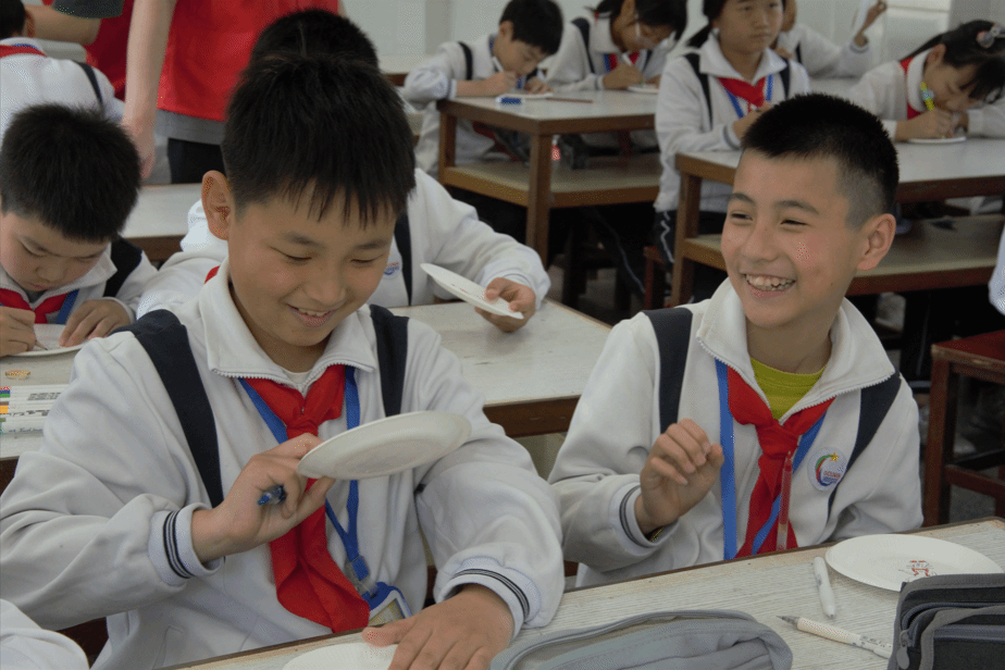 厝角头,也称五行山墙,是沟南许地老建筑中的一种常见的装饰形式,也是潮汕建筑文化的重要组成部分。在课堂上,教学组详细讲解厝角头背后的创作灵感、艺术特色,时不时在黑板上示范绘画,还通过“击鼓传花”小游戏加深孩子们对厝角头的认识以及对其背后潮汕文化底蕴的理解。随后,沟南小学的同学们围绕厝角头,用画笔绘制出五彩斑斓的厝角头。有的画出繁花似锦的厝角头,有的将潮汕英歌舞人物融入飞檐,画面中都洋溢着孩子们自己的奇思妙想以及对家乡的热爱。