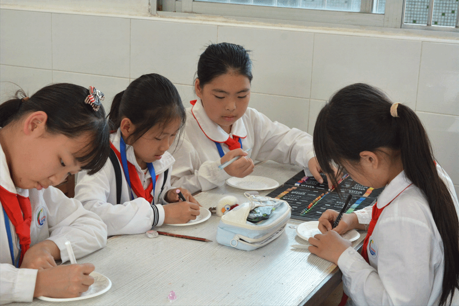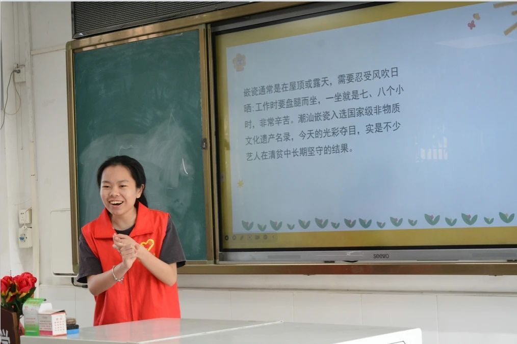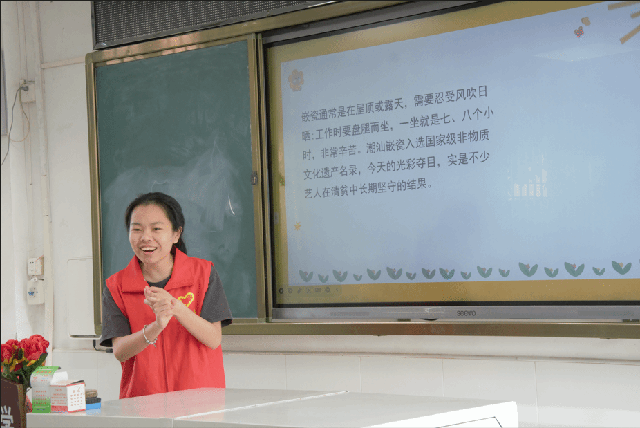 教学组同学向孩子们讲授嵌瓷这一潮汕非遗项目