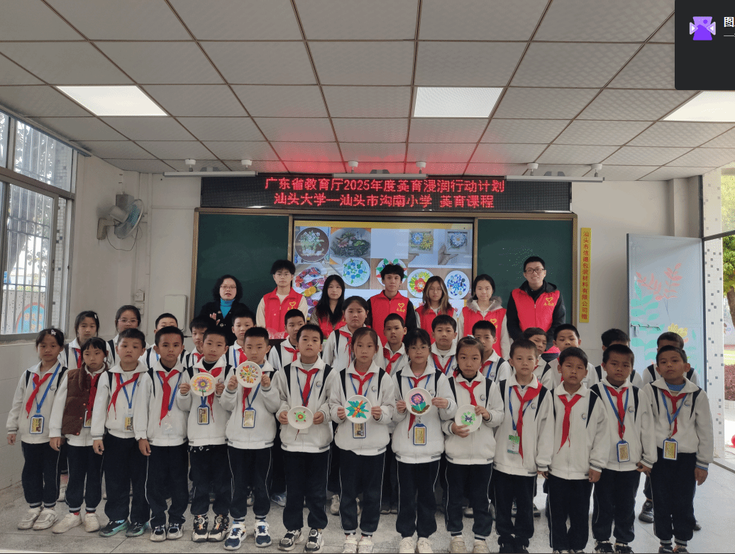 为推进2025年广东省教育厅美育浸润行动计划有效实施,继续推进美育浸润工作向纵深发展,以“双百行动”推进“百千万工程”,2025年3月,bevictor伟德官网“乡村艺课”服务性劳动课程师生团队走进汕头市沟南小学开展美育浸润行动。团队以校园文化为切入点,扎实开展美育课程和墙绘设计等活动,在孩子们心中播下艺术的种子。