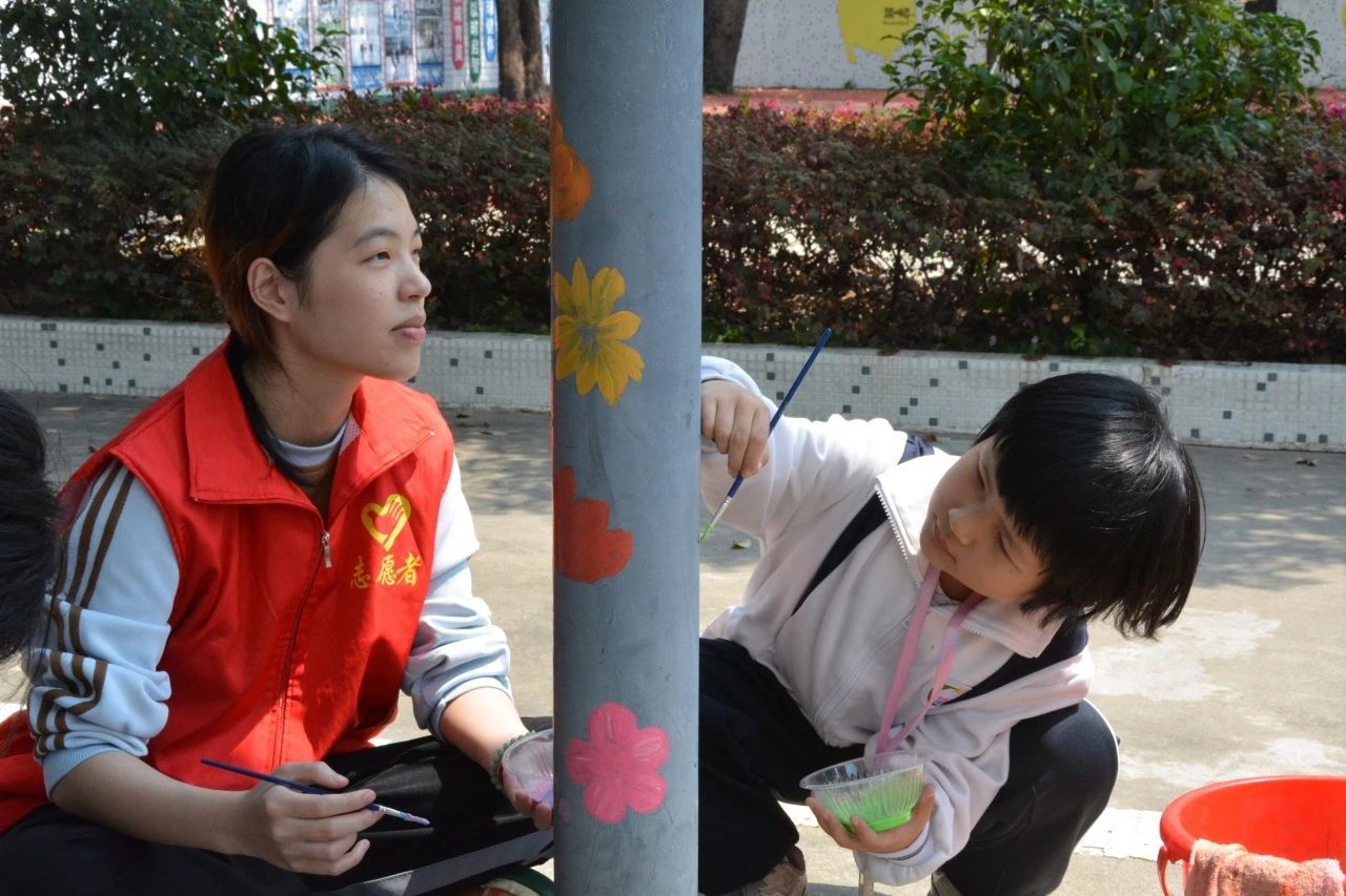 孩子们与墙绘组同学一起美化校园