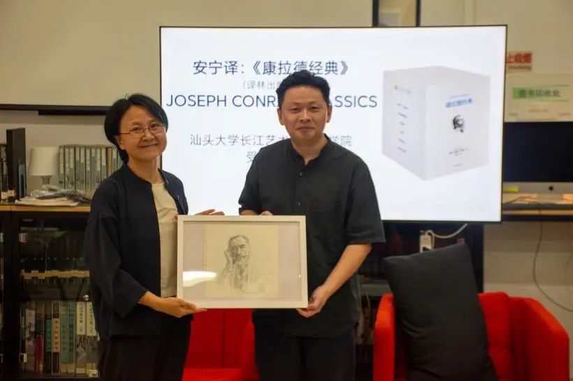 仪式最后,温平老师将近期所作的一幅康拉德素描赠与安宁老师,作为这段文学缘分的象征。